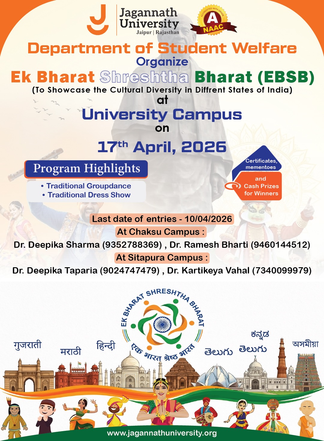 Jagan Nath University, Jaipur has been established by an Act of the Rajasthan State Legislature (Act No. 19 of 2008) on April 16, 2008, approved under section 2(f) by the UGC Act, 1956, accredited by NAAC (2nd Cycle) with "A" grade in 2022 and is member of the Association of Indian Universities (AIU). The University has also acquired a distinctive status in agriculture education of having been accredited by ICAR for 5 years its B.Sc. (Hons.) Agriculture program. The University is offering UG and PG programs in the areas of...