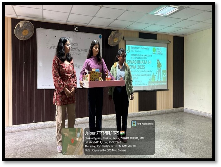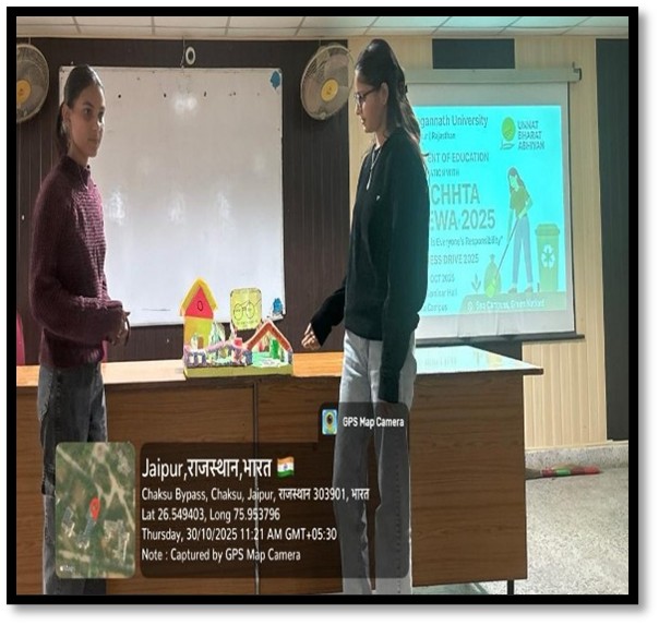 The Department of Education, in collaboration with Unnat Bharat Abhiyan, Jagannath University, Jaipur, organized an awareness activity under the DARPG Special Campaign 5.0 on 30th October 2025. The aim of this campaign was to spread awareness regarding cleanliness, sanitation, and civic responsibility. The event reflected the spirit of the national initiative Swachhata Hi Seva and emphasized the role of education in shaping responsible citizens.