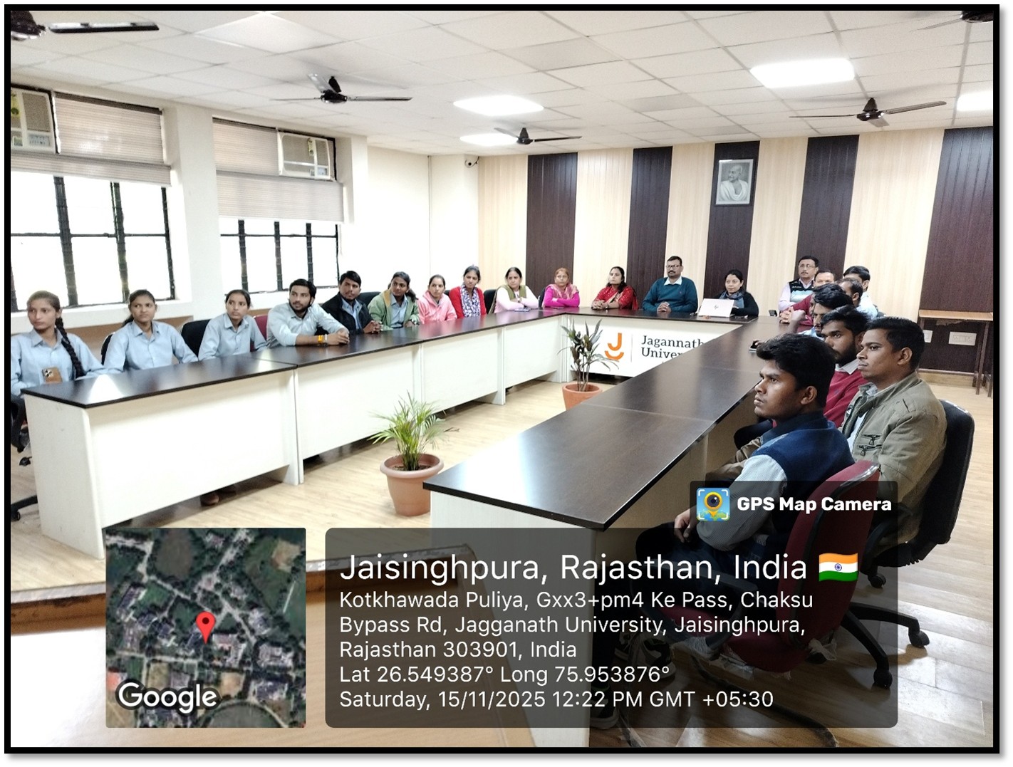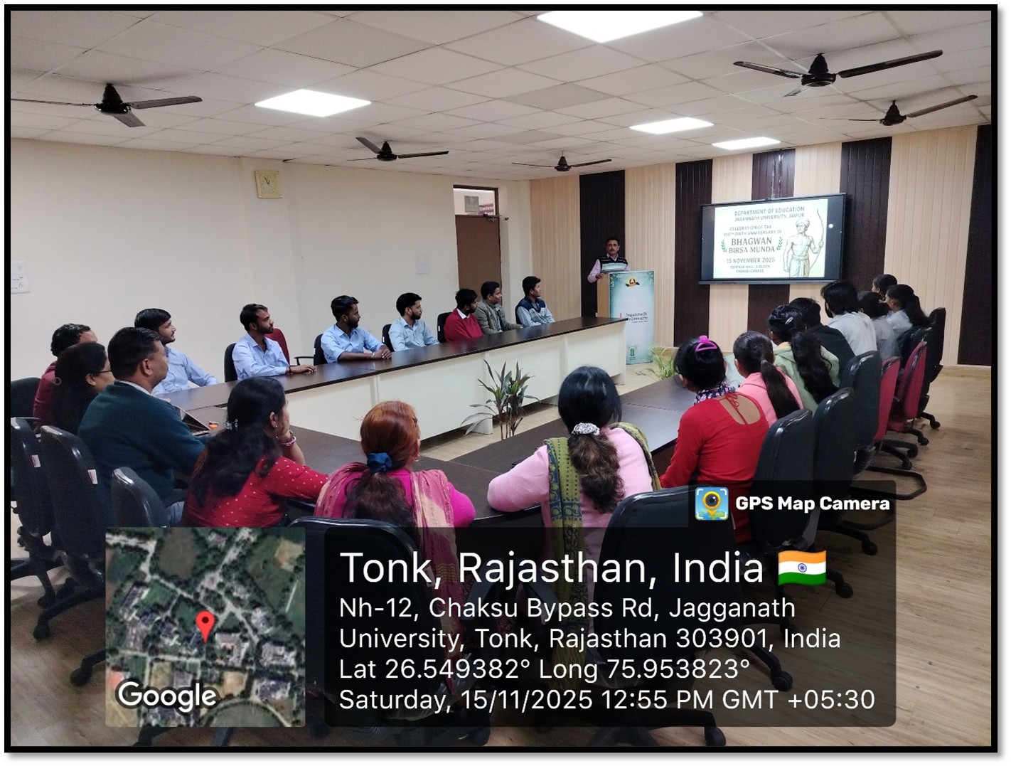 The Department of Education, Jagannath University, Jaipur celebrated Janjatiya Gaurav Diwas on 15 November 2025 to honour the birth anniversary of Bhagwan Birsa Munda and to recognize the cultural heritage and contributions of India’s tribal communities. The program included a welcome address, a documentary screening on the life and struggle of Birsa Munda, cultural performances, speeches, and a skit highlighting tribal history and the Ulgulan Movement.