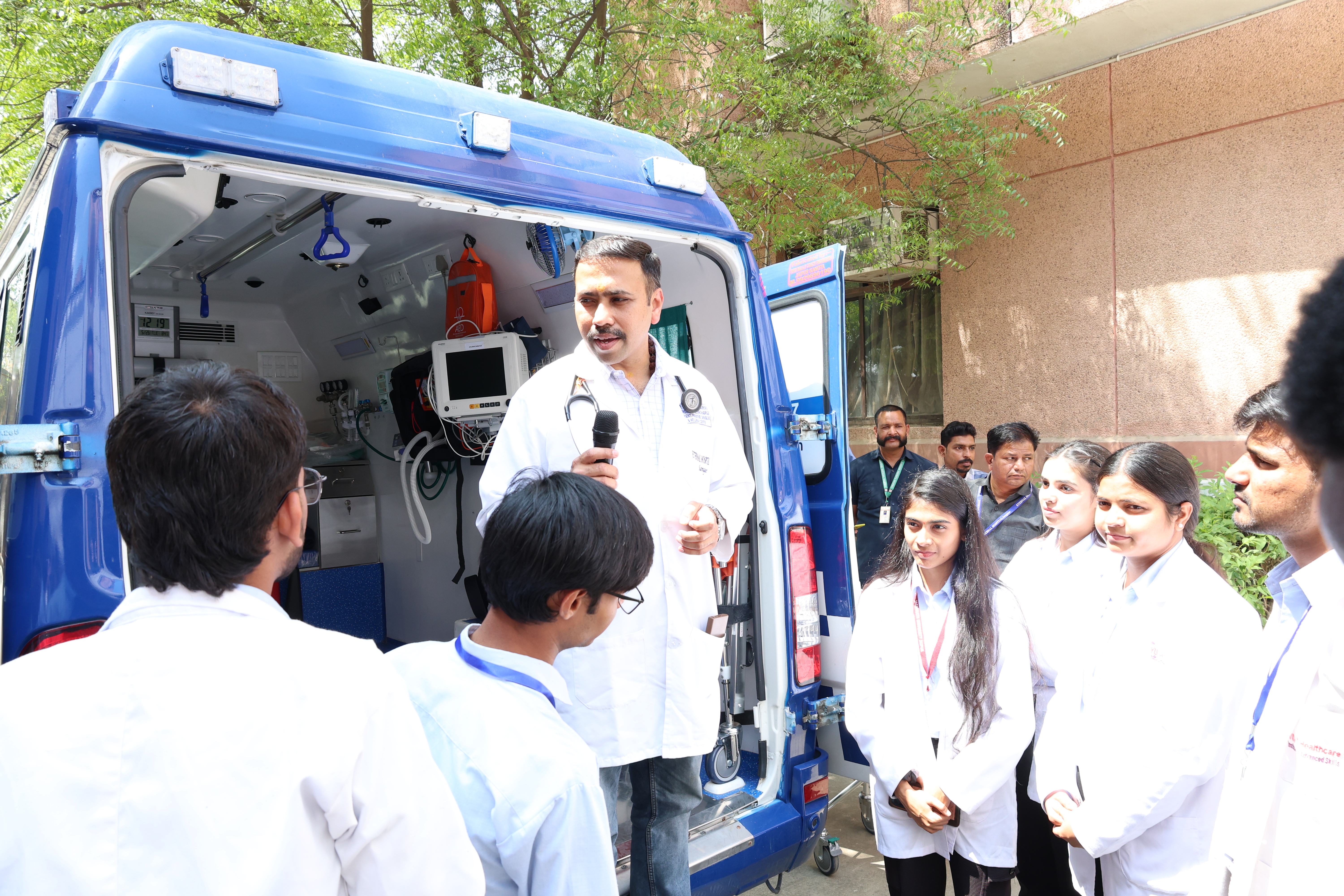 The highlight of the day was the emergency mock drill, where students actively participated in simulated emergency scenarios, enhancing their response skills.Workshops such as ICU on Wheels, Blood Transfusion Protocol, and Blood Banking Training provided practical exposure to real-life healthcare situations.