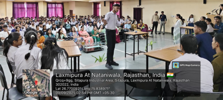 In the afternoon, the spotlight shifted to the Inter-Collegiate Quiz Competition, Brainometer, which brought together some of the brightest minds from participating universities. Teams from Jagannath University, Jaipur National University, Swasthya Kalyan Institute, MJRP University, Vivekananda Global University, and SGVU battled in a fast-paced buzzer-based contest. The quiz comprised several rounds that tested academic knowledge, reasoning skills, and quick decision-making abilities. The rounds grew progressively more challenging, keeping the participants and audience highly engaged. Jagannath University, as the host institution, demonstrated exceptional preparation and confidence, ultimately securing the first position and bringing pride to the university. Their victory underscored the department’s commitment to academic excellence and student preparedness.