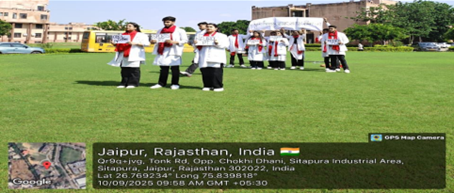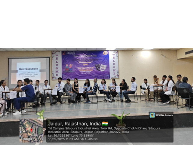 The Department of Physiotherapy, Jagannath University, Jaipur, organised the first day of the World Physiotherapy Day celebrations on 9th September 2025 with immense enthusiasm and wholehearted participation from students and faculty members. The event witnessed the presence of more than 350 students from all Bachelor of Physiotherapy (BPT) , creating an atmosphere of unity, excitement, and academic spirit.